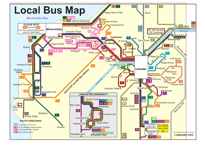 Please note that the Morecambe A-Z only includes services from Morecambe bus station. Service 1/1A to Lancaster is excluded as it does not serve the bus station.