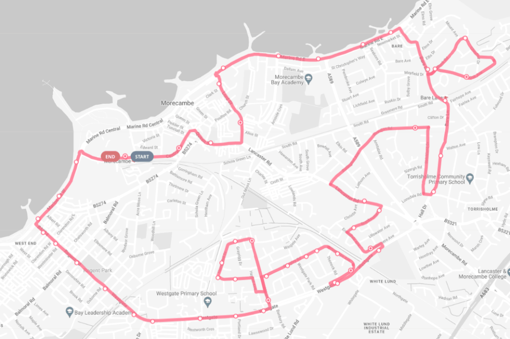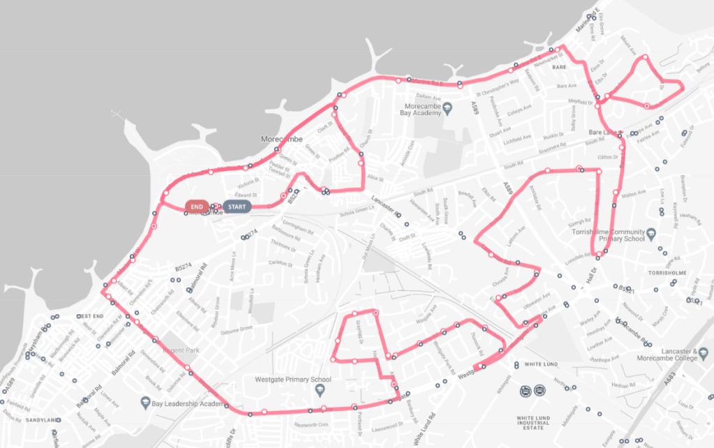 The service header shows it as running between “Heysham” and “Lancaster University”, which in term times is what it does. So why does every journey have a code (9) to say that it “Continues to Lancaster University, Uni Underpass, by.” “Continues to from where?!