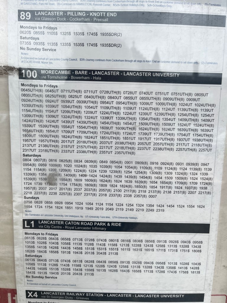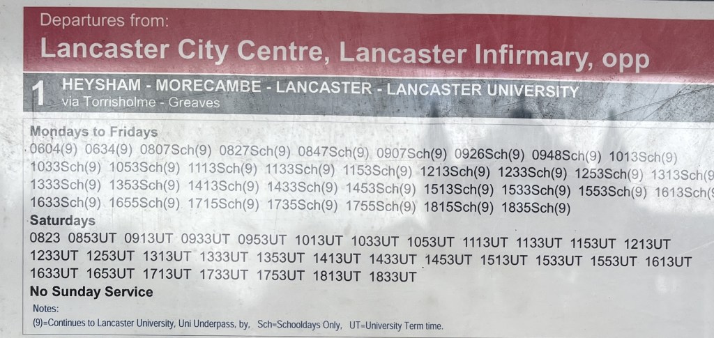 More seriously, every journey is marked with “Sch” to mean “Schooldays only”. Lancaster residents may not know exactly when University terms begin and end (another problem with the displays) but they do know that they are different to school terms. Lancashire’s system does recognise that the Saturday service runs “UT” or “University Term Time” rather than “Schooldays”, presumably because it doesn’t expect Saturday to be a school day.