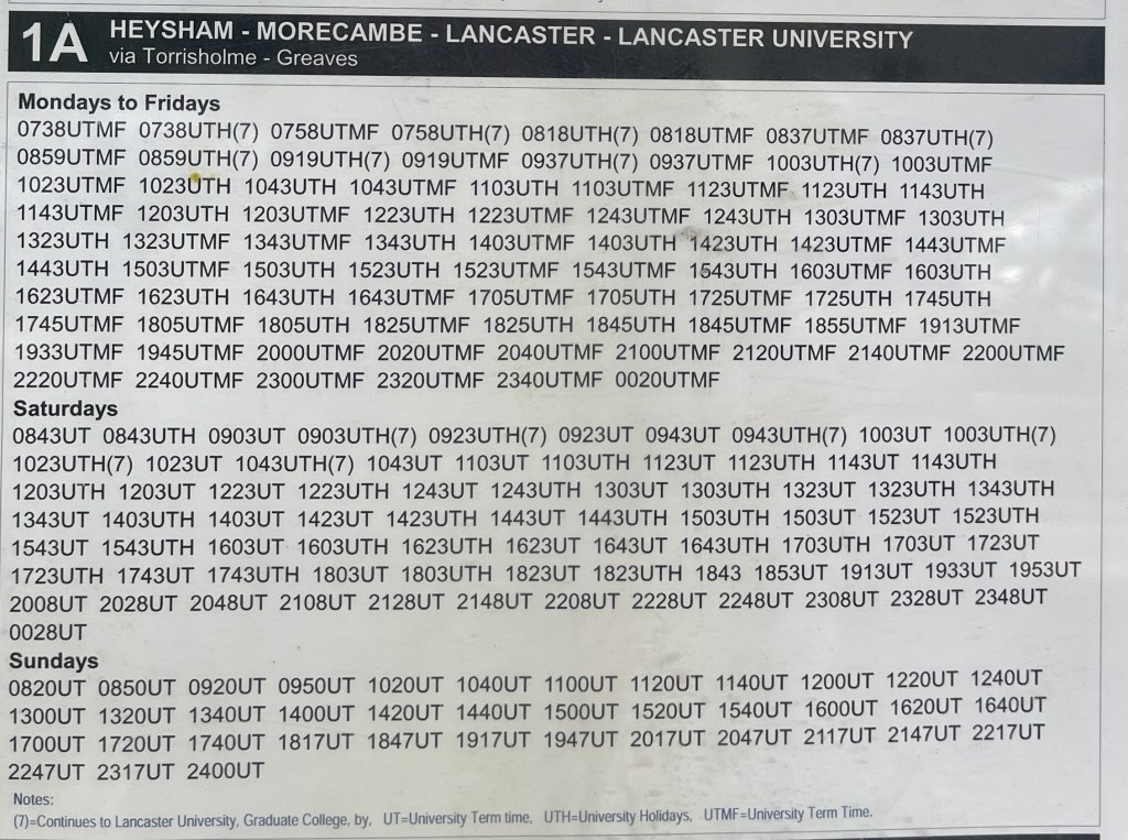 Once again, every journey is shown twice, but on Mondays to Fridays, unlike the 1A, the code UTMF is not used. Journeys are coded “UT- University Terms” or “UTH – University Holidays” Every UTH journey has an additional note: (8) explaining that it “terminates at Lancaster University, Underpass” although as the service header just describes the terminus as “Lancaster University” one wonders how many passengers understand the significance of the note.